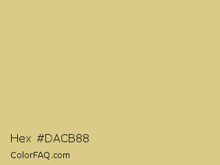 Hex #dacb88 Color is a light yellow color and the nearest color is Putty #e7cd8c. Hex code #dacb88 and RGB value is rgb(218,203,136). In RGB color space, this color is composed of 85% red, 80% green, 53% blue, In CMYK color space, this color is composed of 0% cyan, 7% magenta, 38% yellow , 15% black , In HSL color space, this color has a hue angle of 49° , 53% saturation and 69% lightness.