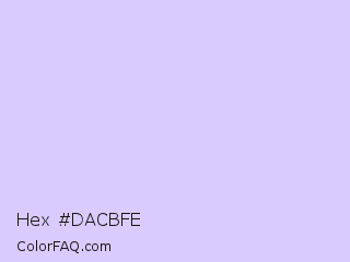 Hex #dacbfe Color is a very light indigo color and the nearest color is Pale Lavender #dcd0ff. Hex code #dacbfe and RGB value is rgb(218,203,254). In RGB color space, this color is composed of 85% red, 80% green, 100% blue, In CMYK color space, this color is composed of 14% cyan, 20% magenta, 0% yellow , 0% black , In HSL color space, this color has a hue angle of 258° , 96% saturation and 90% lightness.