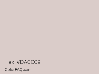 Hex #daccc9 Color is a very light red color and the nearest color is Wafer #decbc6. Hex code #daccc9 and RGB value is rgb(218,204,201). In RGB color space, this color is composed of 85% red, 80% green, 79% blue, In CMYK color space, this color is composed of 0% cyan, 6% magenta, 8% yellow , 15% black , In HSL color space, this color has a hue angle of 11° , 19% saturation and 82% lightness.