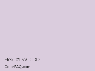 Hex #daccdd Color is a very light purple color and the nearest color is Languid Lavender #d6cadd. Hex code #daccdd and RGB value is rgb(218,204,221). In RGB color space, this color is composed of 85% red, 80% green, 87% blue, In CMYK color space, this color is composed of 1% cyan, 8% magenta, 0% yellow , 13% black , In HSL color space, this color has a hue angle of 289° , 20% saturation and 83% lightness.
