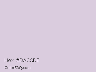 Hex #daccde Color is a very light purple color and the nearest color is Languid Lavender #d6cadd. Hex code #daccde and RGB value is rgb(218,204,222). In RGB color space, this color is composed of 85% red, 80% green, 87% blue, In CMYK color space, this color is composed of 2% cyan, 8% magenta, 0% yellow , 13% black , In HSL color space, this color has a hue angle of 287° , 21% saturation and 84% lightness.