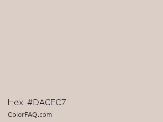 Hex #dacec7 Color is a very light orange color and the nearest color is Wafer #decbc6. Hex code #dacec7 and RGB value is rgb(218,206,199). In RGB color space, this color is composed of 85% red, 81% green, 78% blue, In CMYK color space, this color is composed of 0% cyan, 6% magenta, 9% yellow , 15% black , In HSL color space, this color has a hue angle of 22° , 20% saturation and 82% lightness.