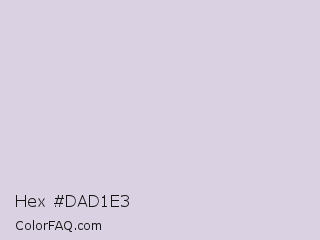 Hex #dad1e3 Color is a very light violet color and the nearest color is Lola #dfcfdb. Hex code #dad1e3 and RGB value is rgb(218,209,227). In RGB color space, this color is composed of 85% red, 82% green, 89% blue, In CMYK color space, this color is composed of 4% cyan, 8% magenta, 0% yellow , 11% black , In HSL color space, this color has a hue angle of 270° , 24% saturation and 85% lightness.