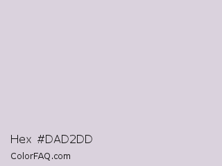 Hex #dad2dd Color is a very light purple color and the nearest color is Lola #dfcfdb. Hex code #dad2dd and RGB value is rgb(218,210,221). In RGB color space, this color is composed of 85% red, 82% green, 87% blue, In CMYK color space, this color is composed of 1% cyan, 5% magenta, 0% yellow , 13% black , In HSL color space, this color has a hue angle of 284° , 14% saturation and 85% lightness.