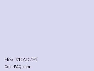 Hex #dad7f1 Color is a very light indigo color and the nearest color is Snuff #e2d8ed. Hex code #dad7f1 and RGB value is rgb(218,215,241). In RGB color space, this color is composed of 85% red, 84% green, 95% blue, In CMYK color space, this color is composed of 10% cyan, 11% magenta, 0% yellow , 5% black , In HSL color space, this color has a hue angle of 247° , 48% saturation and 89% lightness.