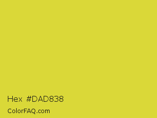 Hex #dad838 Color is a normal yellow color and the nearest color is Wattle #dcd747. Hex code #dad838 and RGB value is rgb(218,216,56). In RGB color space, this color is composed of 85% red, 85% green, 22% blue, In CMYK color space, this color is composed of 0% cyan, 1% magenta, 74% yellow , 15% black , In HSL color space, this color has a hue angle of 59° , 69% saturation and 54% lightness.