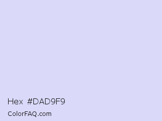 Hex #dad9f9 Color is a very light indigo color and the nearest color is Pale Lavender #dcd0ff. Hex code #dad9f9 and RGB value is rgb(218,217,249). In RGB color space, this color is composed of 85% red, 85% green, 98% blue, In CMYK color space, this color is composed of 12% cyan, 13% magenta, 0% yellow , 2% black , In HSL color space, this color has a hue angle of 242° , 73% saturation and 91% lightness.