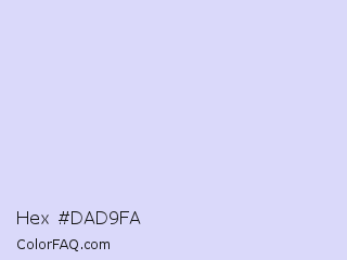 Hex #dad9fa Color is a very light indigo color and the nearest color is Pale Lavender #dcd0ff. Hex code #dad9fa and RGB value is rgb(218,217,250). In RGB color space, this color is composed of 85% red, 85% green, 98% blue, In CMYK color space, this color is composed of 13% cyan, 13% magenta, 0% yellow , 2% black , In HSL color space, this color has a hue angle of 242° , 77% saturation and 92% lightness.