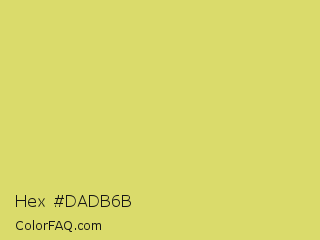 Hex #dadb6b Color is a light yellow color and the nearest color is Booger Buster #dde26a. Hex code #dadb6b and RGB value is rgb(218,219,107). In RGB color space, this color is composed of 85% red, 86% green, 42% blue, In CMYK color space, this color is composed of 0% cyan, 0% magenta, 51% yellow , 14% black , In HSL color space, this color has a hue angle of 61° , 61% saturation and 64% lightness.