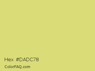 Hex #dadc78 Color is a light yellow color and the nearest color is Straw #e4d96f. Hex code #dadc78 and RGB value is rgb(218,220,120). In RGB color space, this color is composed of 85% red, 86% green, 47% blue, In CMYK color space, this color is composed of 1% cyan, 0% magenta, 45% yellow , 14% black , In HSL color space, this color has a hue angle of 61° , 59% saturation and 67% lightness.