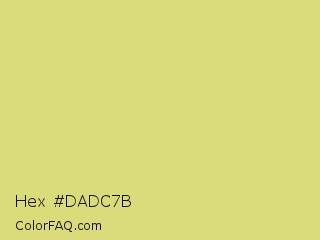 Hex #dadc7b Color is a light yellow color and the nearest color is Straw #e4d96f. Hex code #dadc7b and RGB value is rgb(218,220,123). In RGB color space, this color is composed of 85% red, 86% green, 48% blue, In CMYK color space, this color is composed of 1% cyan, 0% magenta, 44% yellow , 14% black , In HSL color space, this color has a hue angle of 61° , 58% saturation and 67% lightness.