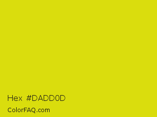 Hex #dadd0d Color is a normal yellow color and the nearest color is Piss Yellow #e1e115. Hex code #dadd0d and RGB value is rgb(218,221,13). In RGB color space, this color is composed of 85% red, 87% green, 5% blue, In CMYK color space, this color is composed of 1% cyan, 0% magenta, 94% yellow , 13% black , In HSL color space, this color has a hue angle of 61° , 89% saturation and 46% lightness.