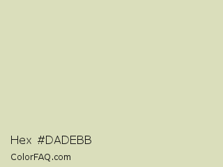 Hex #dadebb Color is a light yellow color and the nearest color is Tana #d9dcc1. Hex code #dadebb and RGB value is rgb(218,222,187). In RGB color space, this color is composed of 85% red, 87% green, 73% blue, In CMYK color space, this color is composed of 2% cyan, 0% magenta, 16% yellow , 13% black , In HSL color space, this color has a hue angle of 67° , 35% saturation and 80% lightness.