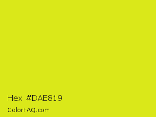 Hex #dae819 Color is a normal yellow color and the nearest color is Piss Yellow #e1e115. Hex code #dae819 and RGB value is rgb(218,232,25). In RGB color space, this color is composed of 85% red, 91% green, 10% blue, In CMYK color space, this color is composed of 6% cyan, 0% magenta, 89% yellow , 9% black , In HSL color space, this color has a hue angle of 64° , 82% saturation and 50% lightness.