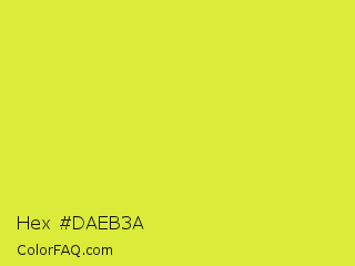 Hex #daeb3a Color is a normal yellow color and the nearest color is Pear #d1e231. Hex code #daeb3a and RGB value is rgb(218,235,58). In RGB color space, this color is composed of 85% red, 92% green, 23% blue, In CMYK color space, this color is composed of 7% cyan, 0% magenta, 75% yellow , 8% black , In HSL color space, this color has a hue angle of 66° , 82% saturation and 57% lightness.