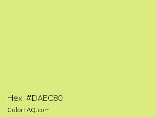 Hex #daec80 Color is a light yellow color and the nearest color is Mindaro #e3f988. Hex code #daec80 and RGB value is rgb(218,236,128). In RGB color space, this color is composed of 85% red, 93% green, 50% blue, In CMYK color space, this color is composed of 8% cyan, 0% magenta, 46% yellow , 7% black , In HSL color space, this color has a hue angle of 70° , 74% saturation and 71% lightness.