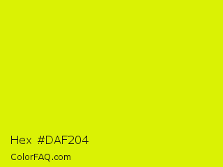 Hex #daf204 Color is a normal yellow color and the nearest color is Chartreuse Yellow #dfff00. Hex code #daf204 and RGB value is rgb(218,242,4). In RGB color space, this color is composed of 85% red, 95% green, 2% blue, In CMYK color space, this color is composed of 10% cyan, 0% magenta, 98% yellow , 5% black , In HSL color space, this color has a hue angle of 66° , 97% saturation and 48% lightness.
