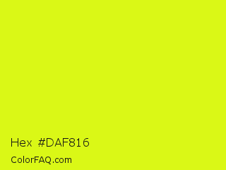 Hex #daf816 Color is a normal yellow color and the nearest color is Arctic Lime #d0ff14. Hex code #daf816 and RGB value is rgb(218,248,22). In RGB color space, this color is composed of 85% red, 97% green, 9% blue, In CMYK color space, this color is composed of 12% cyan, 0% magenta, 91% yellow , 3% black , In HSL color space, this color has a hue angle of 68° , 94% saturation and 53% lightness.