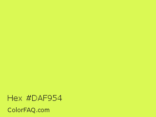 Hex #daf954 Color is a light lime color and the nearest color is Maximum Green Yellow #d9e650. Hex code #daf954 and RGB value is rgb(218,249,84). In RGB color space, this color is composed of 85% red, 98% green, 33% blue, In CMYK color space, this color is composed of 12% cyan, 0% magenta, 66% yellow , 2% black , In HSL color space, this color has a hue angle of 71° , 93% saturation and 65% lightness.