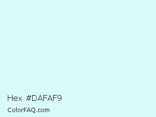 Hex #dafaf9 Color is a very light cyan color and the nearest color is Foam #d8fcfa. Hex code #dafaf9 and RGB value is rgb(218,250,249). In RGB color space, this color is composed of 85% red, 98% green, 98% blue, In CMYK color space, this color is composed of 13% cyan, 0% magenta, 0% yellow , 2% black , In HSL color space, this color has a hue angle of 178° , 76% saturation and 92% lightness.