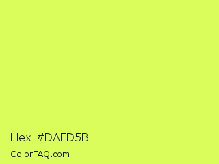 Hex #dafd5b Color is a light lime color and the nearest color is Maximum Green Yellow #d9e650. Hex code #dafd5b and RGB value is rgb(218,253,91). In RGB color space, this color is composed of 85% red, 99% green, 36% blue, In CMYK color space, this color is composed of 14% cyan, 0% magenta, 64% yellow , 1% black , In HSL color space, this color has a hue angle of 73° , 98% saturation and 67% lightness.
