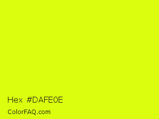Hex #dafe0e Color is a normal yellow color and the nearest color is Arctic Lime #d0ff14. Hex code #dafe0e and RGB value is rgb(218,254,14). In RGB color space, this color is composed of 85% red, 100% green, 5% blue, In CMYK color space, this color is composed of 14% cyan, 0% magenta, 94% yellow , 0% black , In HSL color space, this color has a hue angle of 69° , 99% saturation and 53% lightness.