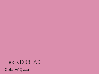 Hex #db8ead Color is a light rose color and the nearest color is Light Thulian Pink #e68fac. Hex code #db8ead and RGB value is rgb(219,142,173). In RGB color space, this color is composed of 86% red, 56% green, 68% blue, In CMYK color space, this color is composed of 0% cyan, 35% magenta, 21% yellow , 14% black , In HSL color space, this color has a hue angle of 336° , 52% saturation and 71% lightness.