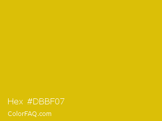 Hex #dbbf07 Color is a normal yellow color and the nearest color is Corn #e7bf05. Hex code #dbbf07 and RGB value is rgb(219,191,7). In RGB color space, this color is composed of 86% red, 75% green, 3% blue, In CMYK color space, this color is composed of 0% cyan, 13% magenta, 97% yellow , 14% black , In HSL color space, this color has a hue angle of 52° , 94% saturation and 44% lightness.