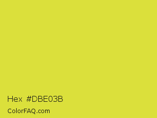 Hex #dbe03b Color is a normal yellow color and the nearest color is Pear #d1e231. Hex code #dbe03b and RGB value is rgb(219,224,59). In RGB color space, this color is composed of 86% red, 88% green, 23% blue, In CMYK color space, this color is composed of 2% cyan, 0% magenta, 74% yellow , 12% black , In HSL color space, this color has a hue angle of 62° , 73% saturation and 55% lightness.