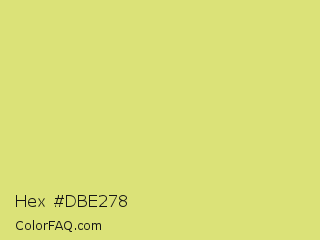 Hex #dbe278 Color is a light yellow color and the nearest color is Booger Buster #dde26a. Hex code #dbe278 and RGB value is rgb(219,226,120). In RGB color space, this color is composed of 86% red, 89% green, 47% blue, In CMYK color space, this color is composed of 3% cyan, 0% magenta, 47% yellow , 11% black , In HSL color space, this color has a hue angle of 64° , 65% saturation and 68% lightness.
