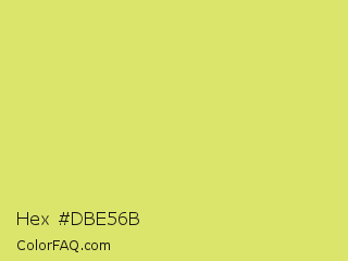 Hex #dbe56b Color is a light yellow color and the nearest color is Booger Buster #dde26a. Hex code #dbe56b and RGB value is rgb(219,229,107). In RGB color space, this color is composed of 86% red, 90% green, 42% blue, In CMYK color space, this color is composed of 4% cyan, 0% magenta, 53% yellow , 10% black , In HSL color space, this color has a hue angle of 65° , 70% saturation and 66% lightness.