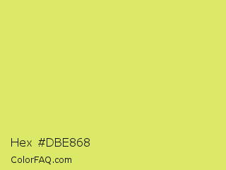 Hex #dbe868 Color is a light yellow color and the nearest color is Booger Buster #dde26a. Hex code #dbe868 and RGB value is rgb(219,232,104). In RGB color space, this color is composed of 86% red, 91% green, 41% blue, In CMYK color space, this color is composed of 6% cyan, 0% magenta, 55% yellow , 9% black , In HSL color space, this color has a hue angle of 66° , 74% saturation and 66% lightness.
