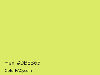 Hex #dbeb65 Color is a light yellow color and the nearest color is Booger Buster #dde26a. Hex code #dbeb65 and RGB value is rgb(219,235,101). In RGB color space, this color is composed of 86% red, 92% green, 40% blue, In CMYK color space, this color is composed of 7% cyan, 0% magenta, 57% yellow , 8% black , In HSL color space, this color has a hue angle of 67° , 77% saturation and 66% lightness.