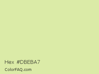 Hex #dbeba7 Color is a light lime color and the nearest color is Caper #dcedb4. Hex code #dbeba7 and RGB value is rgb(219,235,167). In RGB color space, this color is composed of 86% red, 92% green, 65% blue, In CMYK color space, this color is composed of 7% cyan, 0% magenta, 29% yellow , 8% black , In HSL color space, this color has a hue angle of 74° , 63% saturation and 79% lightness.