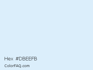 Hex #dbeefb Color is a very light blue color and the nearest color is Pattens Blue #def5ff. Hex code #dbeefb and RGB value is rgb(219,238,251). In RGB color space, this color is composed of 86% red, 93% green, 98% blue, In CMYK color space, this color is composed of 13% cyan, 5% magenta, 0% yellow , 2% black , In HSL color space, this color has a hue angle of 204° , 80% saturation and 92% lightness.