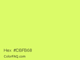 Hex #dbfb68 Color is a light lime color and the nearest color is Canary #f3fb62. Hex code #dbfb68 and RGB value is rgb(219,251,104). In RGB color space, this color is composed of 86% red, 98% green, 41% blue, In CMYK color space, this color is composed of 13% cyan, 0% magenta, 59% yellow , 2% black , In HSL color space, this color has a hue angle of 73° , 95% saturation and 70% lightness.