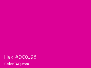 Hex #dc0196 Color is a normal magenta color and the nearest color is Hollywood Cerise #f400a1. Hex code #dc0196 and RGB value is rgb(220,1,150). In RGB color space, this color is composed of 86% red, 0% green, 59% blue, In CMYK color space, this color is composed of 0% cyan, 100% magenta, 32% yellow , 14% black , In HSL color space, this color has a hue angle of 319° , 99% saturation and 43% lightness.