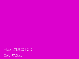Hex #dc01cd Color is a normal magenta color and the nearest color is Deep Magenta #cc00cc. Hex code #dc01cd and RGB value is rgb(220,1,205). In RGB color space, this color is composed of 86% red, 0% green, 80% blue, In CMYK color space, this color is composed of 0% cyan, 100% magenta, 7% yellow , 14% black , In HSL color space, this color has a hue angle of 304° , 99% saturation and 43% lightness.