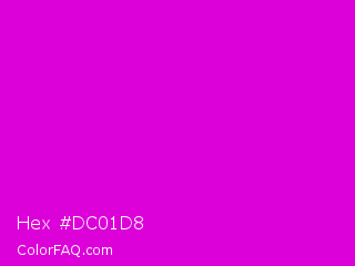 Hex #dc01d8 Color is a normal magenta color and the nearest color is Deep Magenta #cc00cc. Hex code #dc01d8 and RGB value is rgb(220,1,216). In RGB color space, this color is composed of 86% red, 0% green, 85% blue, In CMYK color space, this color is composed of 0% cyan, 100% magenta, 2% yellow , 14% black , In HSL color space, this color has a hue angle of 301° , 99% saturation and 43% lightness.