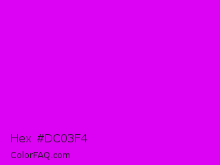 Hex #dc03f4 Color is a normal magenta color and the nearest color is Phlox #df00ff. Hex code #dc03f4 and RGB value is rgb(220,3,244). In RGB color space, this color is composed of 86% red, 1% green, 96% blue, In CMYK color space, this color is composed of 10% cyan, 99% magenta, 0% yellow , 4% black , In HSL color space, this color has a hue angle of 294° , 98% saturation and 48% lightness.