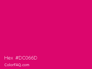 Hex #dc066d Color is a normal rose color and the nearest color is Red Purple #e40078. Hex code #dc066d and RGB value is rgb(220,6,109). In RGB color space, this color is composed of 86% red, 2% green, 43% blue, In CMYK color space, this color is composed of 0% cyan, 97% magenta, 50% yellow , 14% black , In HSL color space, this color has a hue angle of 331° , 95% saturation and 44% lightness.