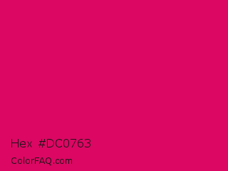 Hex #dc0763 Color is a normal rose color and the nearest color is Raspberry #e30b5d. Hex code #dc0763 and RGB value is rgb(220,7,99). In RGB color space, this color is composed of 86% red, 3% green, 39% blue, In CMYK color space, this color is composed of 0% cyan, 97% magenta, 55% yellow , 14% black , In HSL color space, this color has a hue angle of 334° , 94% saturation and 45% lightness.