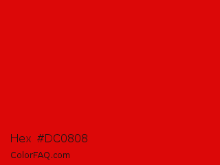 Hex #dc0808 Color is a normal red color and the nearest color is Rosso Corsa #d40000. Hex code #dc0808 and RGB value is rgb(220,8,8). In RGB color space, this color is composed of 86% red, 3% green, 3% blue, In CMYK color space, this color is composed of 0% cyan, 96% magenta, 96% yellow , 14% black , In HSL color space, this color has a hue angle of 0° , 93% saturation and 45% lightness.
