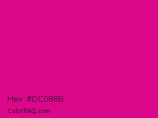 Hex #dc088b Color is a normal magenta color and the nearest color is Mexican Pink #e4007c. Hex code #dc088b and RGB value is rgb(220,8,139). In RGB color space, this color is composed of 86% red, 3% green, 55% blue, In CMYK color space, this color is composed of 0% cyan, 96% magenta, 37% yellow , 14% black , In HSL color space, this color has a hue angle of 323° , 93% saturation and 45% lightness.