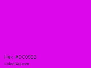 Hex #dc08eb Color is a normal magenta color and the nearest color is Phlox #df00ff. Hex code #dc08eb and RGB value is rgb(220,8,235). In RGB color space, this color is composed of 86% red, 3% green, 92% blue, In CMYK color space, this color is composed of 6% cyan, 97% magenta, 0% yellow , 8% black , In HSL color space, this color has a hue angle of 296° , 93% saturation and 48% lightness.