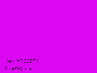Hex #dc08f4 Color is a normal magenta color and the nearest color is Phlox #df00ff. Hex code #dc08f4 and RGB value is rgb(220,8,244). In RGB color space, this color is composed of 86% red, 3% green, 96% blue, In CMYK color space, this color is composed of 10% cyan, 97% magenta, 0% yellow , 4% black , In HSL color space, this color has a hue angle of 294° , 94% saturation and 49% lightness.
