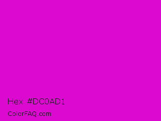 Hex #dc0ad1 Color is a normal magenta color and the nearest color is Deep Magenta #cc00cc. Hex code #dc0ad1 and RGB value is rgb(220,10,209). In RGB color space, this color is composed of 86% red, 4% green, 82% blue, In CMYK color space, this color is composed of 0% cyan, 95% magenta, 5% yellow , 14% black , In HSL color space, this color has a hue angle of 303° , 91% saturation and 45% lightness.