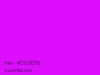 Hex #dc0efb Color is a normal magenta color and the nearest color is Phlox #df00ff. Hex code #dc0efb and RGB value is rgb(220,14,251). In RGB color space, this color is composed of 86% red, 5% green, 98% blue, In CMYK color space, this color is composed of 12% cyan, 94% magenta, 0% yellow , 2% black , In HSL color space, this color has a hue angle of 292° , 97% saturation and 52% lightness.