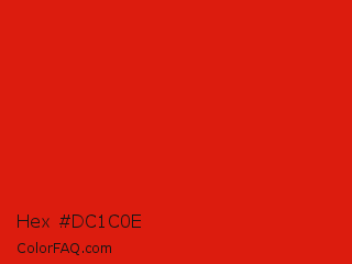 Hex #dc1c0e Color is a normal red color and the nearest color is Maximum Red #d92121. Hex code #dc1c0e and RGB value is rgb(220,28,14). In RGB color space, this color is composed of 86% red, 11% green, 5% blue, In CMYK color space, this color is composed of 0% cyan, 87% magenta, 94% yellow , 14% black , In HSL color space, this color has a hue angle of 4° , 88% saturation and 46% lightness.