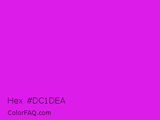 Hex #dc1dea Color is a normal magenta color and the nearest color is Phlox #df00ff. Hex code #dc1dea and RGB value is rgb(220,29,234). In RGB color space, this color is composed of 86% red, 11% green, 92% blue, In CMYK color space, this color is composed of 6% cyan, 88% magenta, 0% yellow , 8% black , In HSL color space, this color has a hue angle of 296° , 83% saturation and 52% lightness.